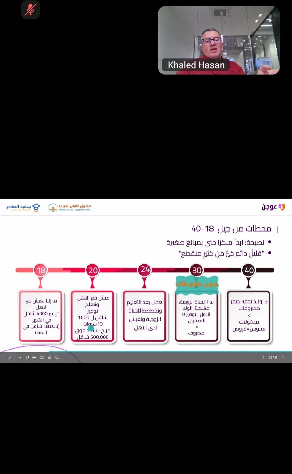 واستعرض حسن الفرص والدعم المالي الذي تقدّمه مؤسسة عوجن للطلاب الجامعيين، موضحًا أن المؤسسة "توفر برامج ومرافقة مالية تهدف إلى تمكين الطلاب من إدارة شؤونهم الاقتصادية بوعي ومسؤولية، وتمنحهم أدوات عملية تساعدهم على اتخاذ قرارات مالية صحيحة".